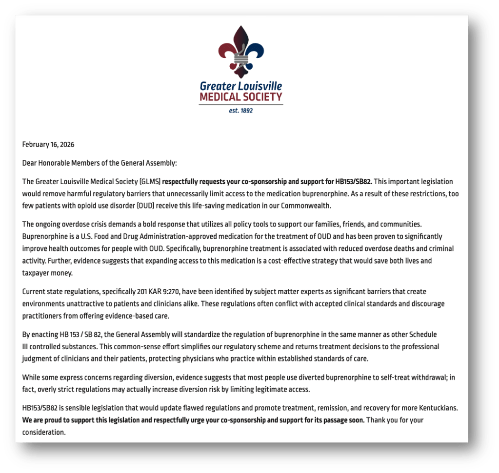 The Greater Louisville Medical Society independently expressed strong support for HB 153 / SB 82 (full letter to the General Assembly attached below), stating: