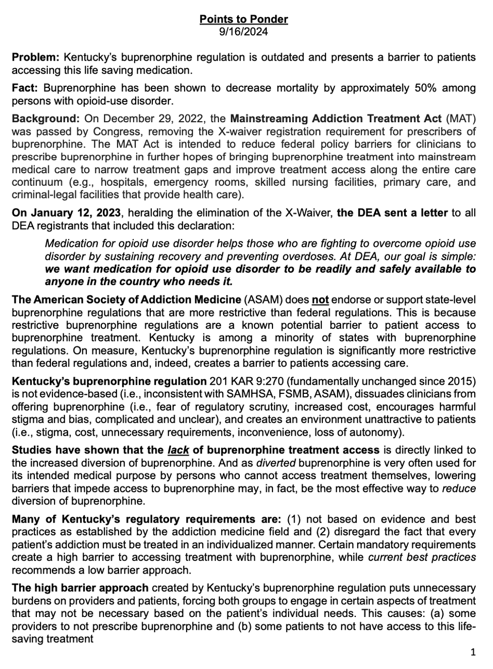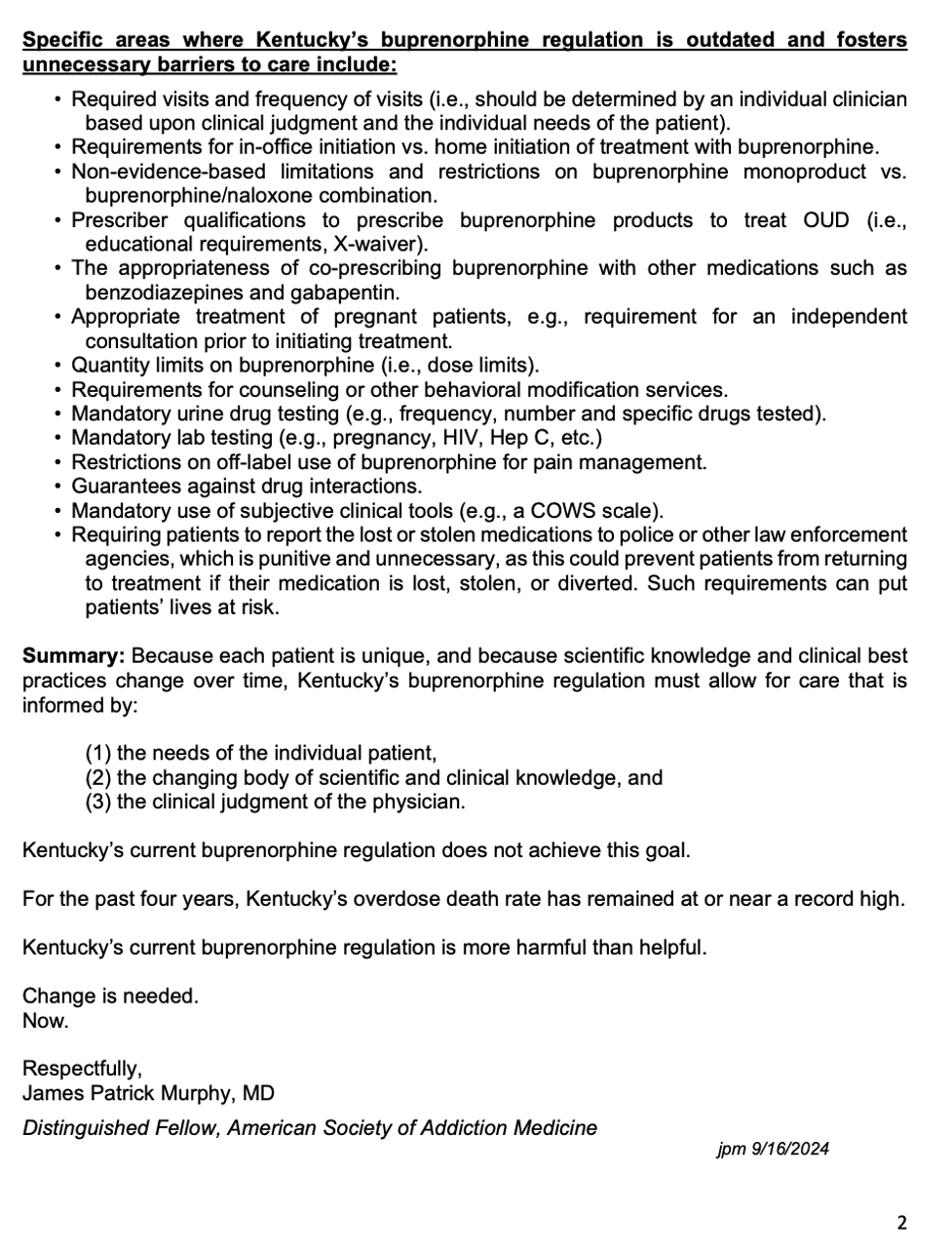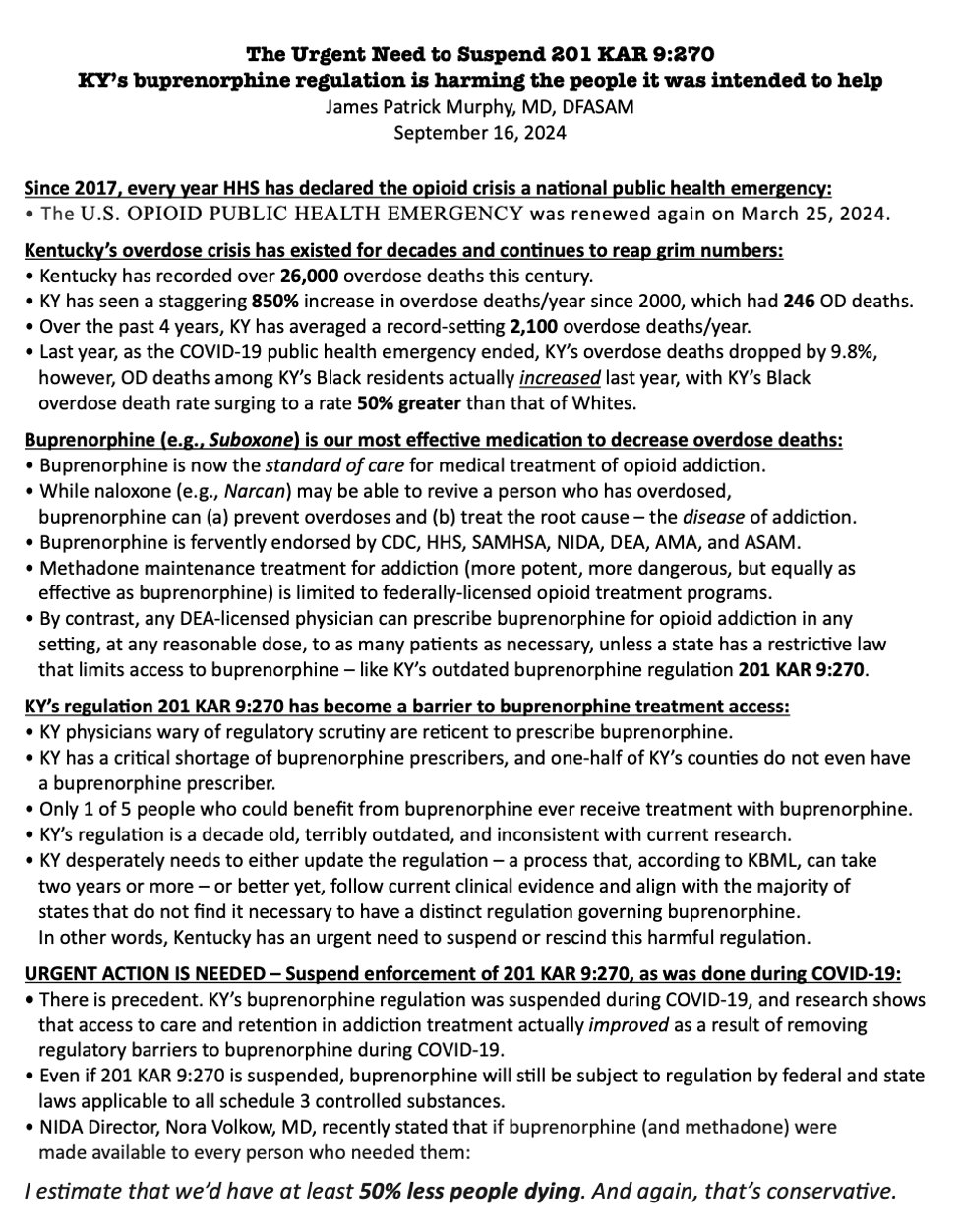 Therefore, to save lives, reduce crime, and improve the health and well-being of our communities, please join the Kentucky Society of Addiction Medicine and support repeal of Kentucky’s buprenorphine regulation 201 KAR 9:270. This decade old law is outdated, unfixable, unnecessary, and harms the people it was intended to help. It mandates actions that are not supported by evidence, actions that inhibit access to treatment, actions that lead to increase drug related crime, and actions that promote fraud, waste, and abuse.
